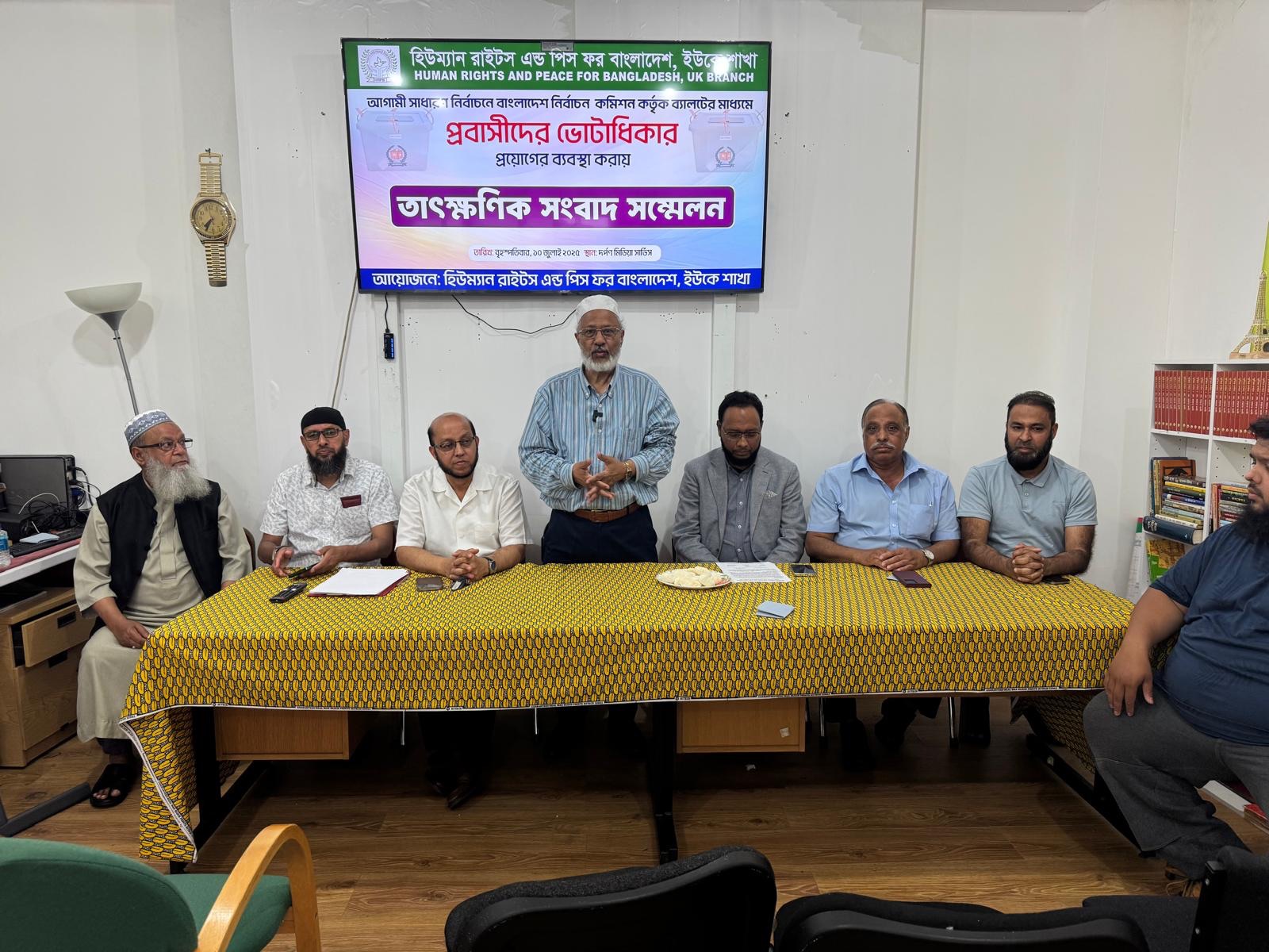আগামী সাধারণ নির্বাচনে প্রবাসীদের দীর্ঘদিনের দাবি ভোটাধিকার বাস্তবায়নের সিদ্ধান্ত নেয়ায় বিষয়টি নিয়ে তাৎক্ষনিকভাবে এক সংবাদ সম্মেলনের আয়োজন করে এ ব্যাপারে আন্দোলনরত মানবাধিকার সংগঠন হিউম্যান রাইটস এন্ড পিস ফর বাংলাদেশ ইউকে। ১০ জুলাই বৃহষ্পতিবার ইস্ট লন্ডনের প্রিন্সলেট স্ট্রিটস্থ দর্পণ মিডিয়া সেন্টারে আয়োজিত এ সংবাদ সম্মেলনে সরকার তথা নির্বাচন কমিশনকে এ পদক্ষেপ গ্রহন করার জন্য ধন্যবাদ জানানো হয়। তবে উল্লেখ করা হয় যে, প্রবাসীরা চেয়েছিলেন, দূতাবাসের মাধ্যমে সরাসরি ভোট প্রদান করবেন কিন্তু তার বদলে সেটা অনলাইনে নিবন্ধন করে পোস্টাল ব্যালটে ভোট নেওয়ার পরিকল্পনা করা হয়েছে। যা হবে সম্পুর্নরুপে আইটি সাপোর্টেড।