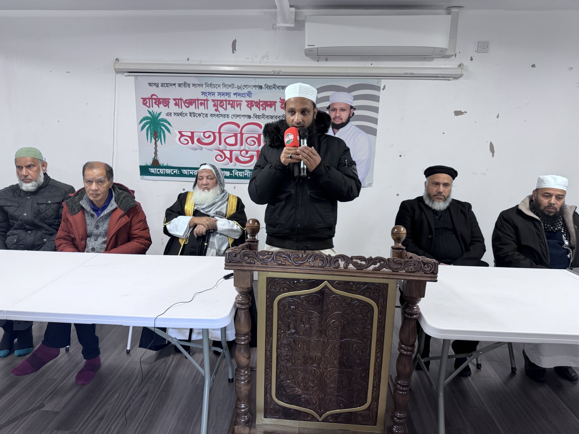 সিলেট-৬ (গোলাপগঞ্জ-বিয়ানীবাজার) আসনে জমিয়তে উলামায়ে ইসলাম বাংলাদেশ মনোনীত খেজুর গাছ প্রতীকের প্রার্থী হাফিজ মাওলানা মুহাম্মদ ফখরুল ইসলাম-এর সমর্থনে লন্ডনে বসবাসরত গোলাপগঞ্জ-বিয়ানীবাজার উপজেলার বাসিন্দাদের নিয়ে এক মত বিনিময় সভা সোমবার সন্ধ্যায় পূর্ব লন্ডনের ফর্ড স্কয়ার মসজিদ কনফারেন্স হলে অনুষ্ঠিত হয়েছে।